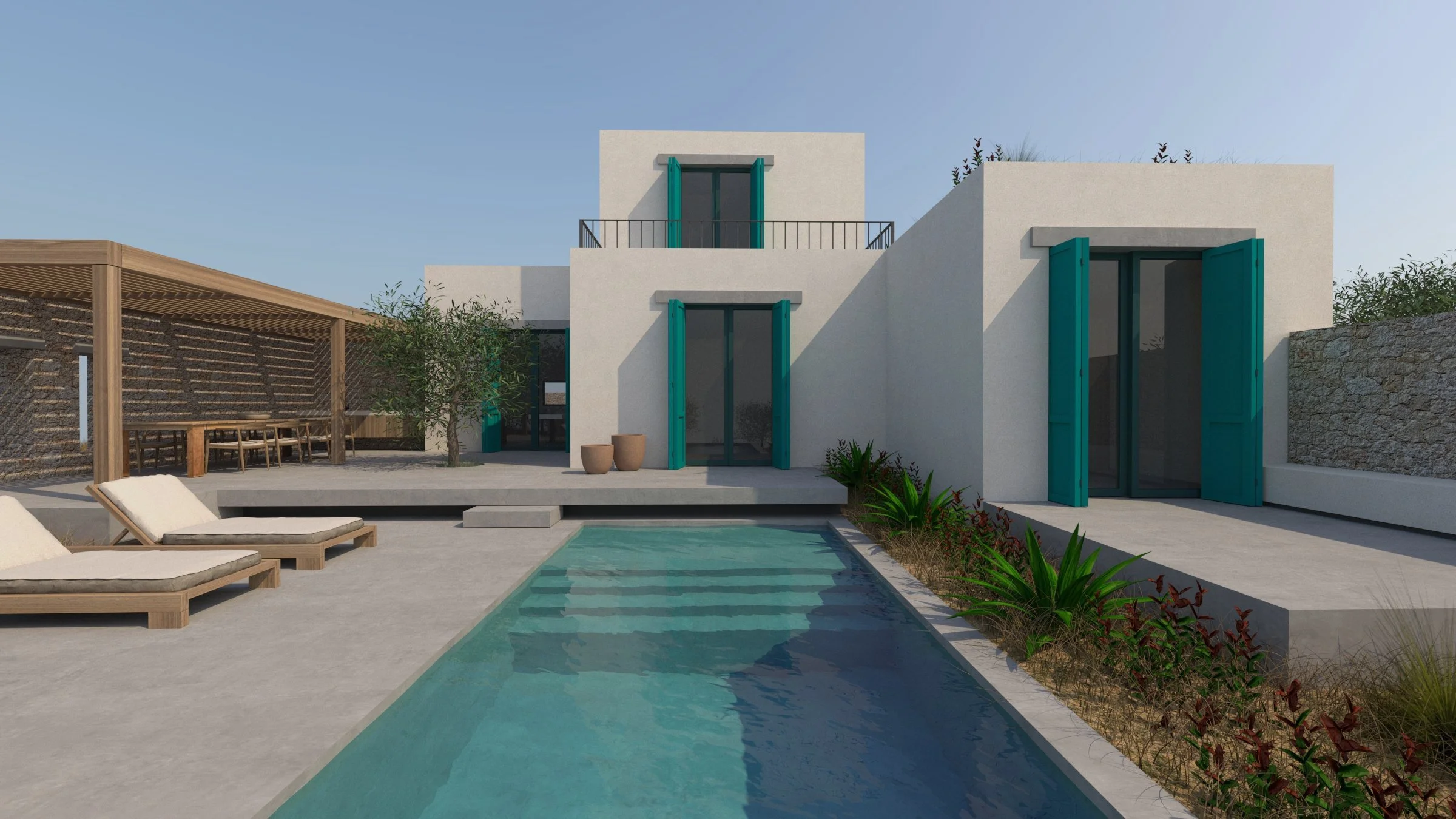 Modern white house with teal shutters, a swimming pool, wooden lounge chairs, and landscaped garden under a clear blue sky.